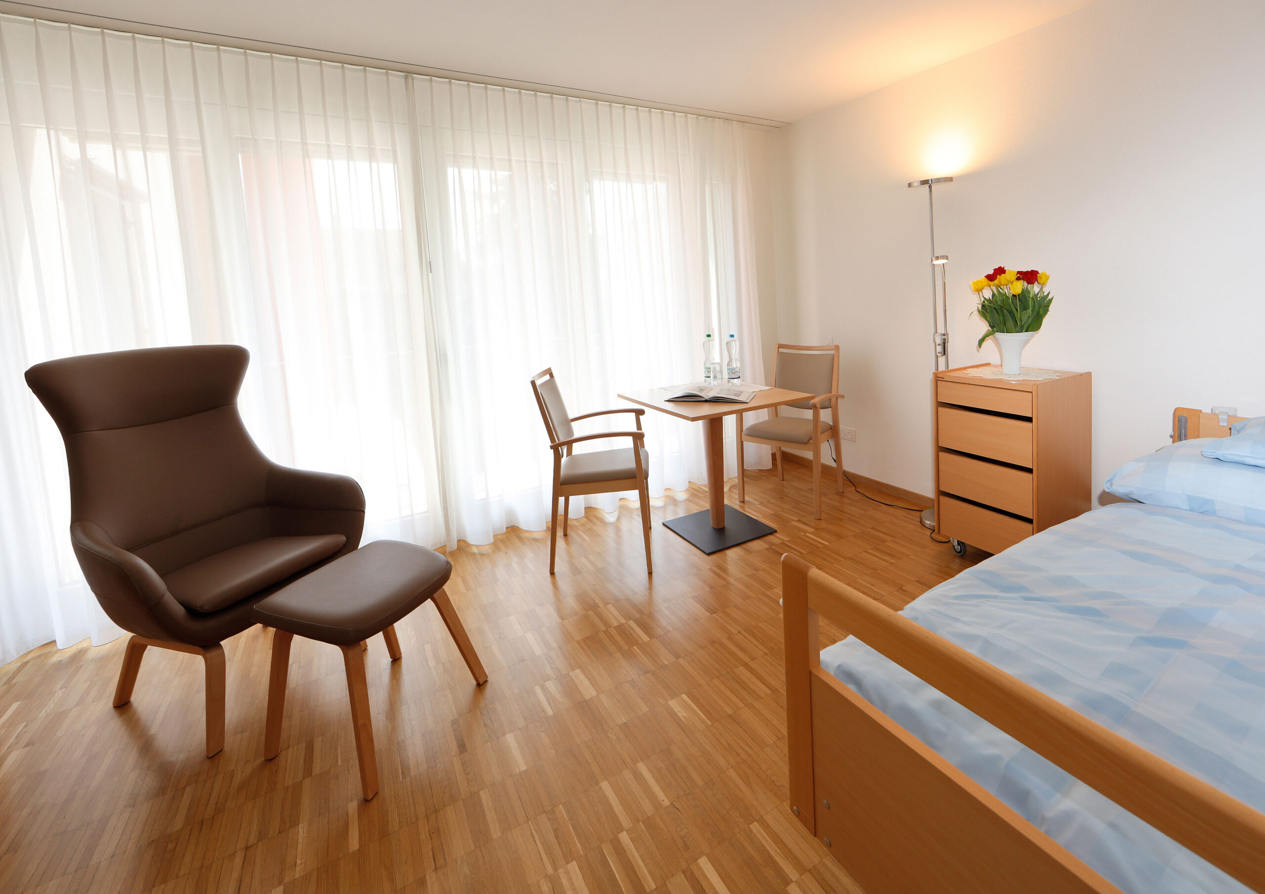 Ein Pflegebett mit passendem Nachttisch, eine Steh- und Bettlampe, ein Einbauschrank und die Nasszelle bilden die Grundausstattung unserer Gästezimmer. Aus Sicherheits- und Hygienegründen bitten wir Sie, auf Teppiche zu verzichten. Unsere Mitarbeitenden der Abteilung Technik sind gerne bereit, Ihnen beim Aufhängen von persönlichen Bildern oder Fotos zu helfen.