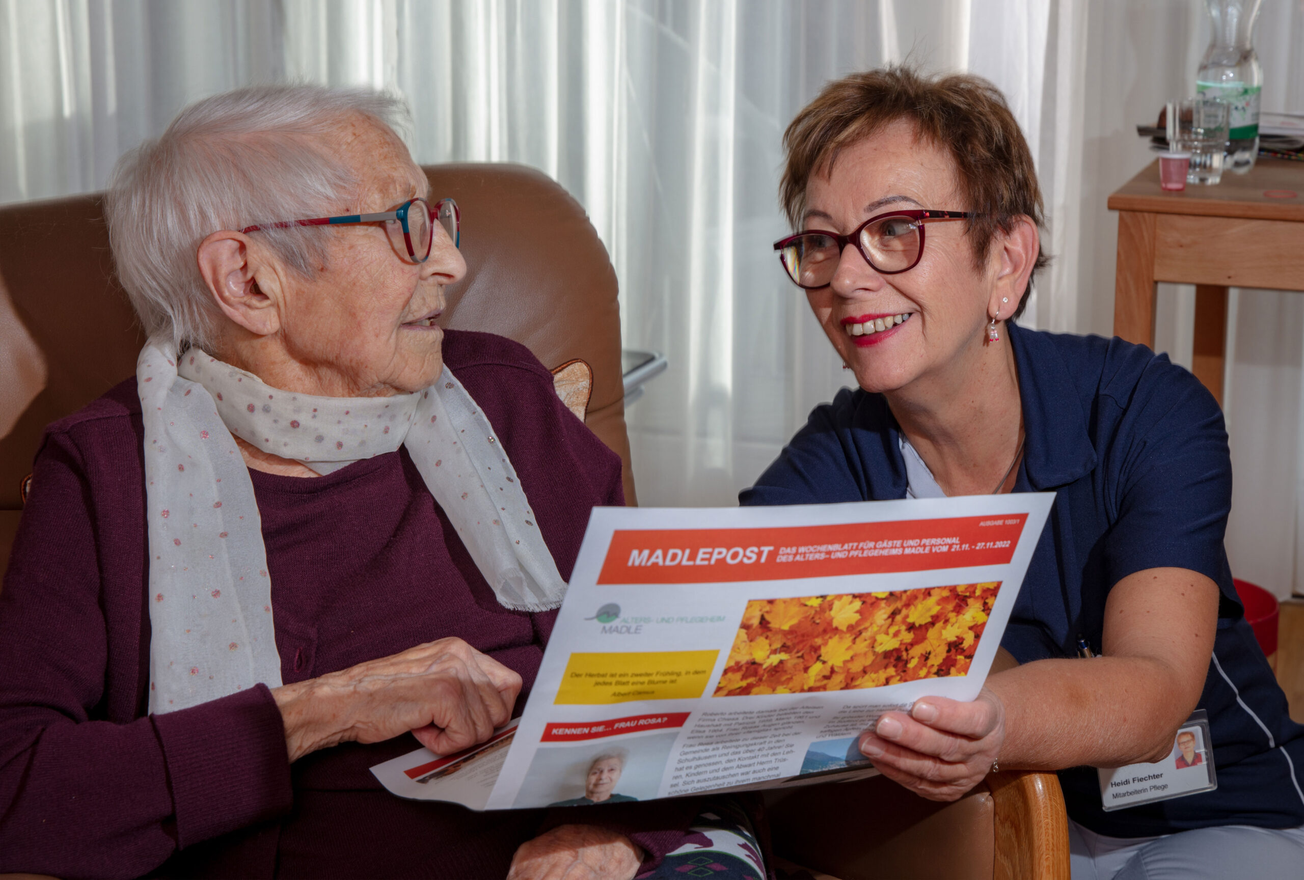 Bei uns stehen Sie im Mittelpunkt: Leben im Madle bedeutet, so selbstständig wie möglich zu bleiben und aktiv am Leben teilzunehmen. Wir gestalten Pflege und Betreuung individuell und orientieren uns dabei an Ihren persönlichen Wünschen, Gewohnheiten und Bedürfnissen – sie stehen für uns im Zentrum.